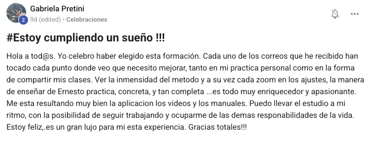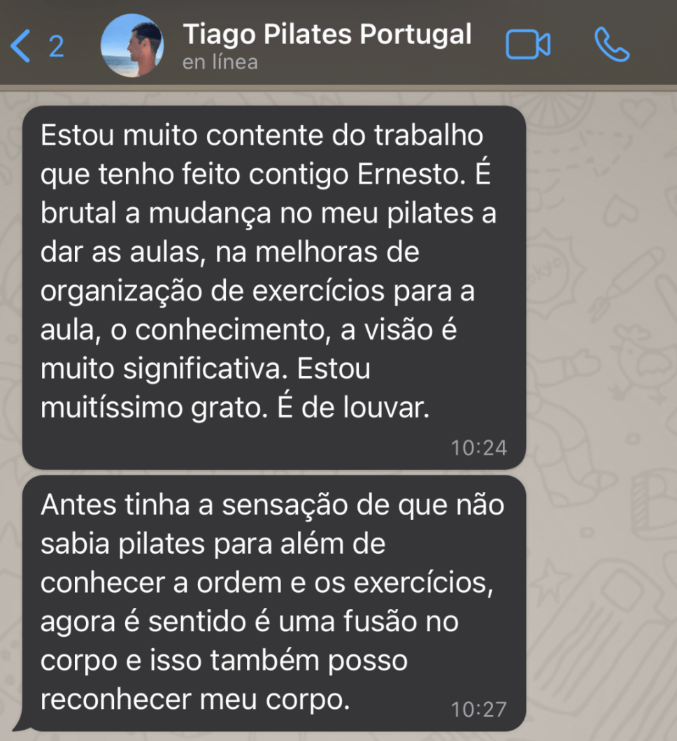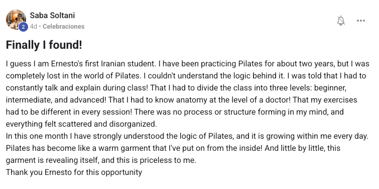 Mil mil gracias de todo Ernesto! Estoy muy contenta que empeze la formación contigo! Me simplificaste Pilates para mi. No significa que sería fácil pero me ha dado mucho esta formación.