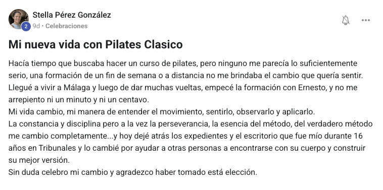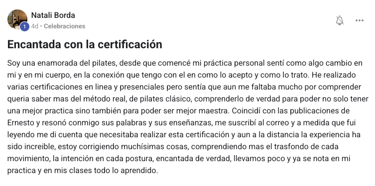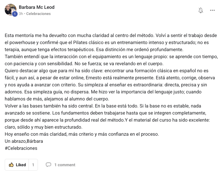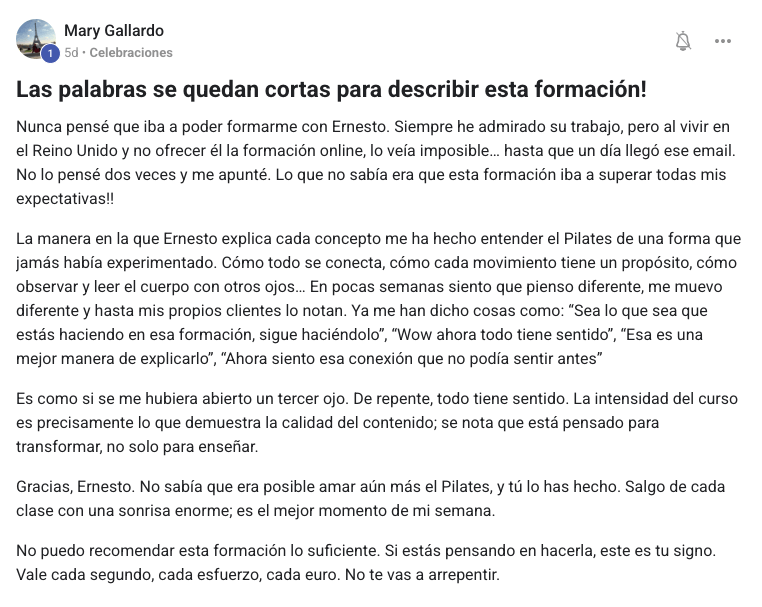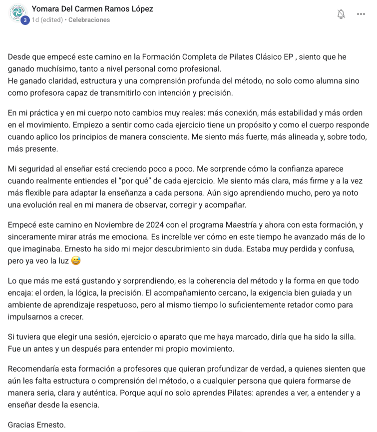 Si alguien está dudando en apuntarse, solo puedo decirle que no lo piense. Esta formación te cambia la manera de entender el Pilates y te abre un camino que no quieres que termine. Para mí ha sido una experiencia transformadora.