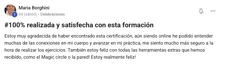 “La formación me ha parecido súper completa porque me ha gustado mucho el control total del cuerpo. Analizar los movimientos en su totalidad y luego específicamente trabajar los movimientos que necesita cada persona. En mi cuerpo he notado los cambios, he notado cómo he ido evolucionando en mi cuerpo. Y he visto todas las mejoras que he hecho de manera gradual. Me ha parecido muy transformadora.”